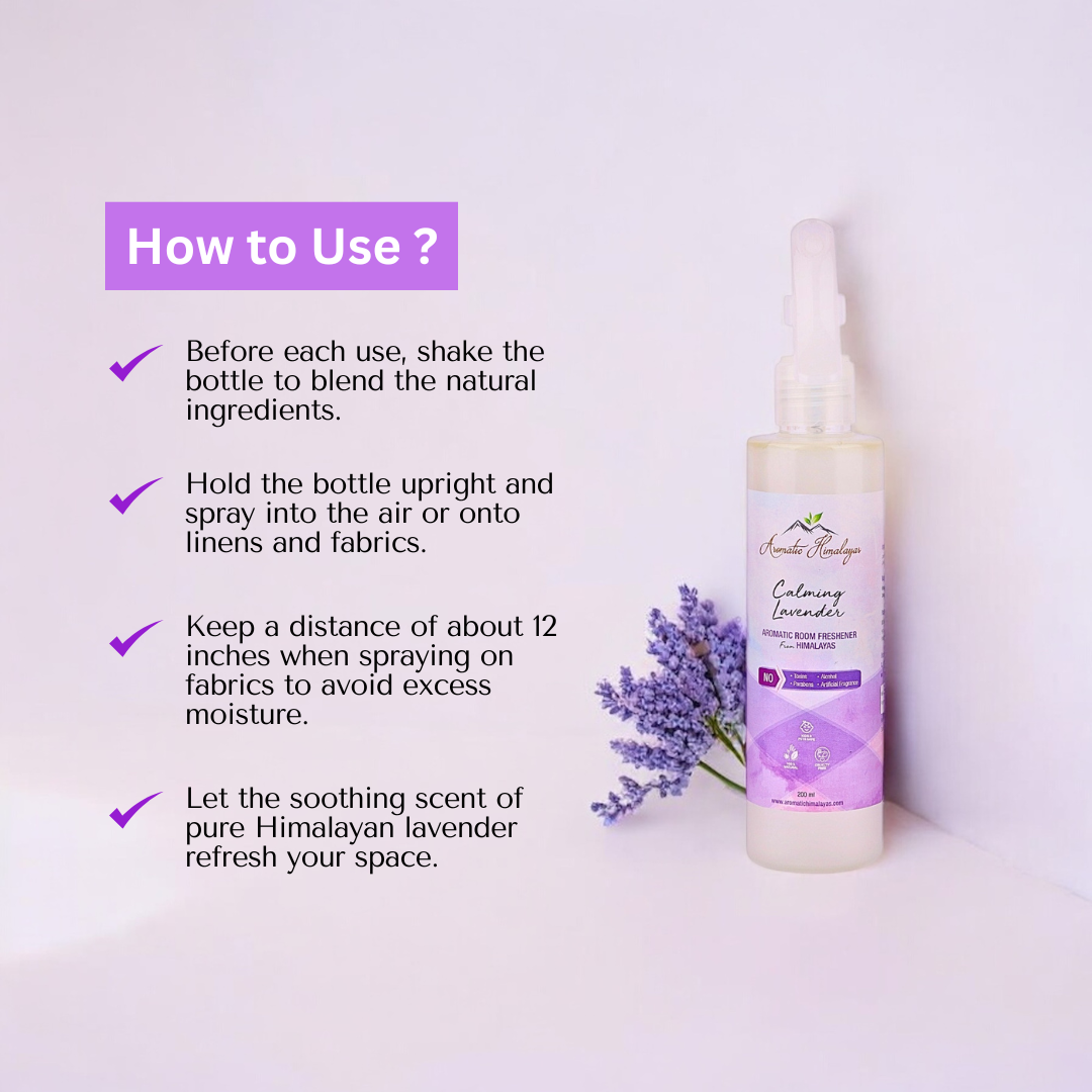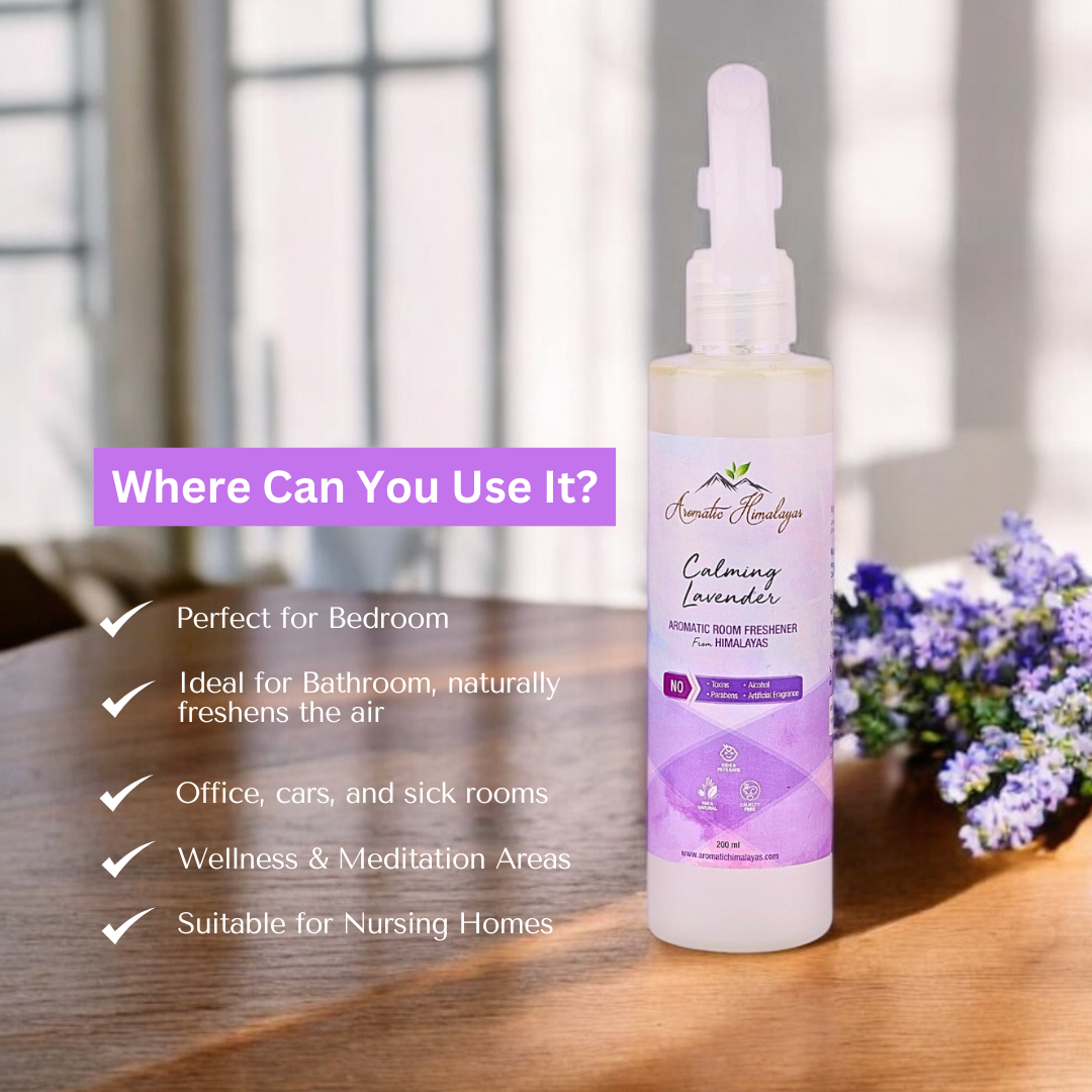 Transform your living space into a serene sanctuary with the Aromatic Himalayas Calming Lavender Room Freshener. Crafted with pure hydrosol and essential oils, this room freshener brings the calming essence of lavender straight from the Himalayas to your home. Elevate your ambiance with the natural goodness of Mother Nature and breathe easier, knowing your air is free from harmful toxins and chemicals. Add the Calming Lavender Room Freshener to your cart now and bring home the serene charm of the Himalayas. Directions for Use: Shake well before each use. Spray lightly into the air or onto linens and fabrics, maintaining a distance of about 12 inches. Enjoy the fresh, calming aroma of lavender while knowing you are breathing clean, pure air.